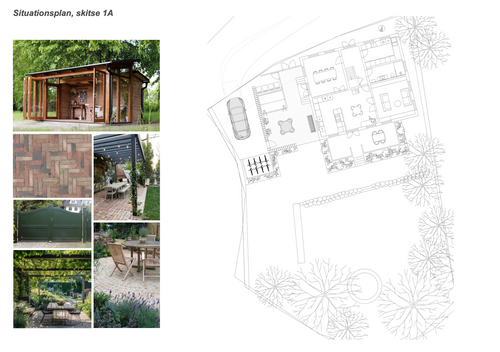 Bygherre har et ønske om et fremtidigt gårdrum, som har direkte udgang fra huset, hvor aftensolen kan nydes i læ under en overdækning i form af et drivhus eller en pergola. Der planlægges udgang via en trætrappe fra den kommende spisestue. Gårdrummet afgrænses fra vejen med et hegn og en dobbeltlåge, som skærmer og skabes privatliv, men samtidig sikrer at det forsat er god adgang til haven. Langs vejen gøres der plads til et skraldeskjul og i tilknytning til gårdrummet planlægges også et mindre cykelskur. Som afgrænsning mod indkørsel etableres en teglstensmur, som begrønnes med klatreplanter for at skabe fornemmelsen af en grøn oase. På fladen foreslås en varm belægningsteglklinke, som kan spille op mod det eksisterende hus røde mursten.